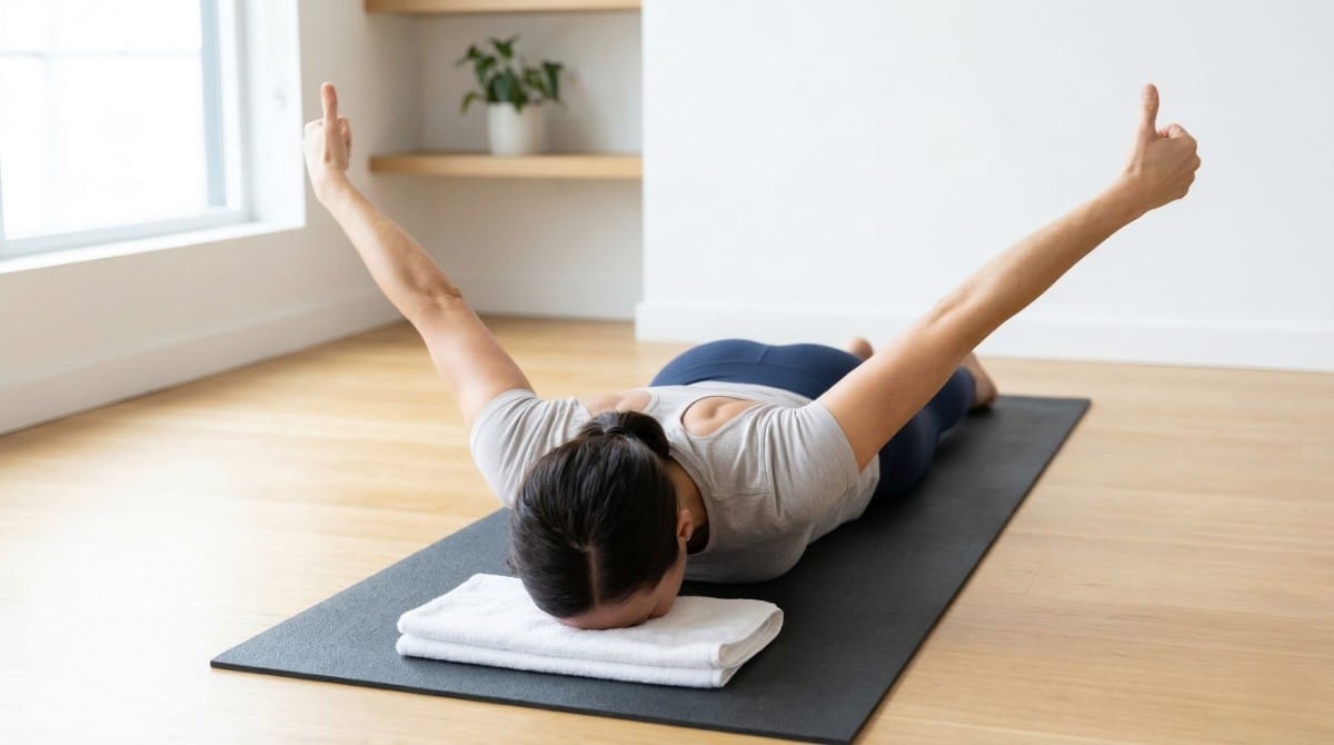 How to do it (Y raise): 1. Lie face down on a mat with your forehead resting lightly on the floor or a folded towel 2. Extend both arms above your head in a Y shape - thumbs pointing toward the ceiling 3. Squeeze your shoulder blades down and together as you lift both arms a few inches off the floor 4. Hold for 3 seconds, lower slowly 5. Repeat 10 times