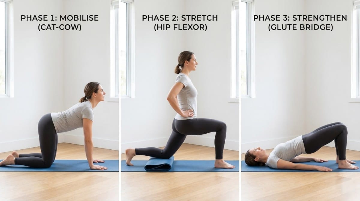 This routine is structured in three phases: mobilise, stretch, strengthen. Each phase targets the specific areas most affected by desk work. The full sequence takes 15 minutes when done efficiently.